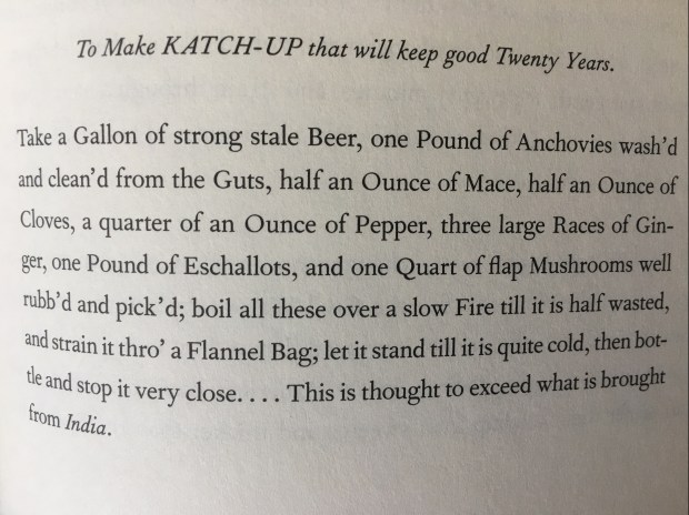 Here’s a recipe that Jurafsky has found from a 1742 London cookbook, in which (Jurafsky points out), the fish sauce has already taken on a British flavor, by adding shallots (‘eschallots’) and mushrooms into the mix. But there is still fish in it – note the anchovies!