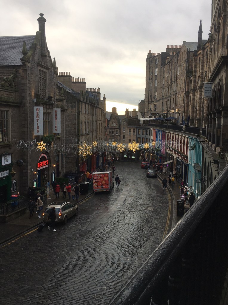 One of the coolest things about doing our walk down the street on this rainy day in Edinburgh was that the street was very atmospheric. ‘Dreich’ is the Scottish word for it. Drizzly. Dreary. Bleak. Gray sky to match gray buildings. But with Christmas lights twinkling cheerfully in shop windows and on the street. Here’s nearby Victoria street looking very festive.