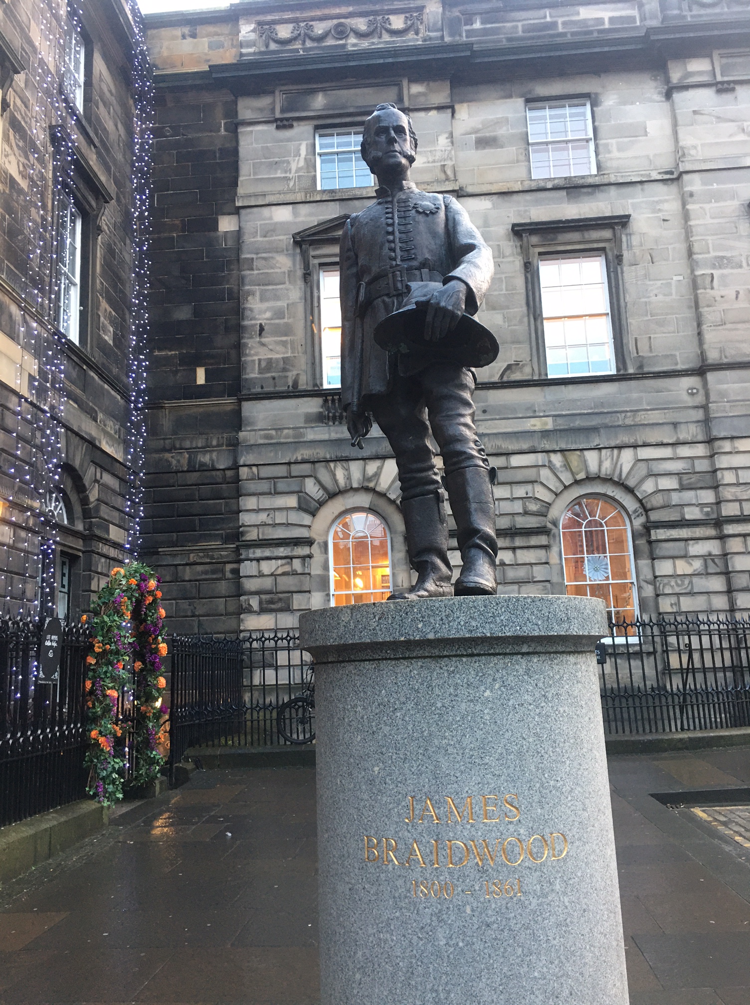 Carrying on down the mile, Alan pointed out the statue of a fascinating Edinburgh fellow I’d never heard of called James Braidwood (1800-1861). He was a fireman who totally revolutionized the way that fires were fought in the UK in the 1800s. Alan told me about how he built houses and insisted on hiring builders to become fireman – people who were trained to understand how buildings worked. He emphasized getting to the source of the fire – not just throwing buckets of water from the outside. Apparently, Braidwood was also very concerned with the safety of the fireman and introduced some of their protective gear like their distinctive hats. He also always made sure that this men were safe and would go back into buildings looking for them.