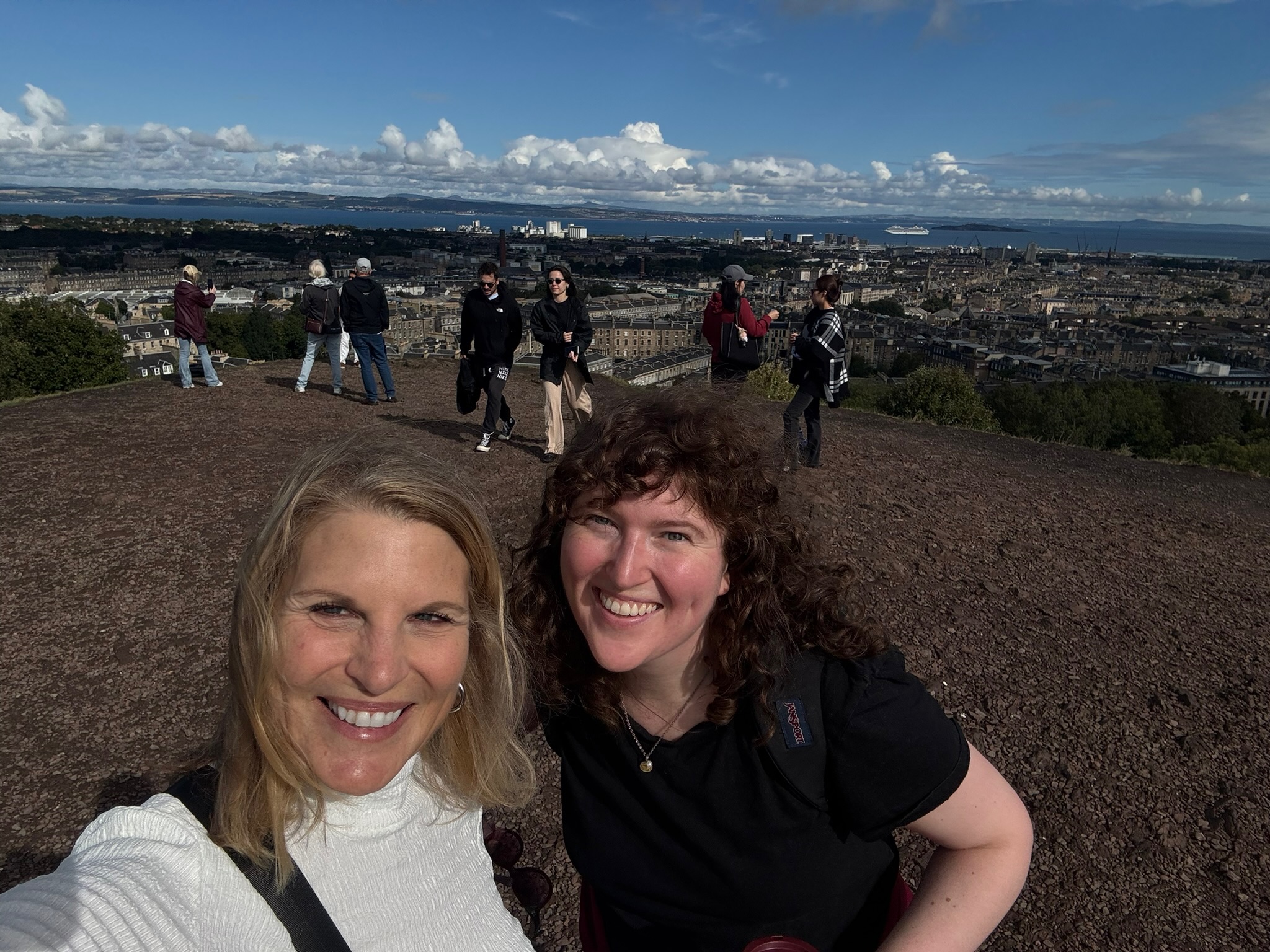 If you look north, you’ll see the Firth of Forth (the body of water separating Edinburgh and Fife) and the neighborhood of Leith, along other things. Here’s my mom and I on a recent walk up there, taking in those views.
