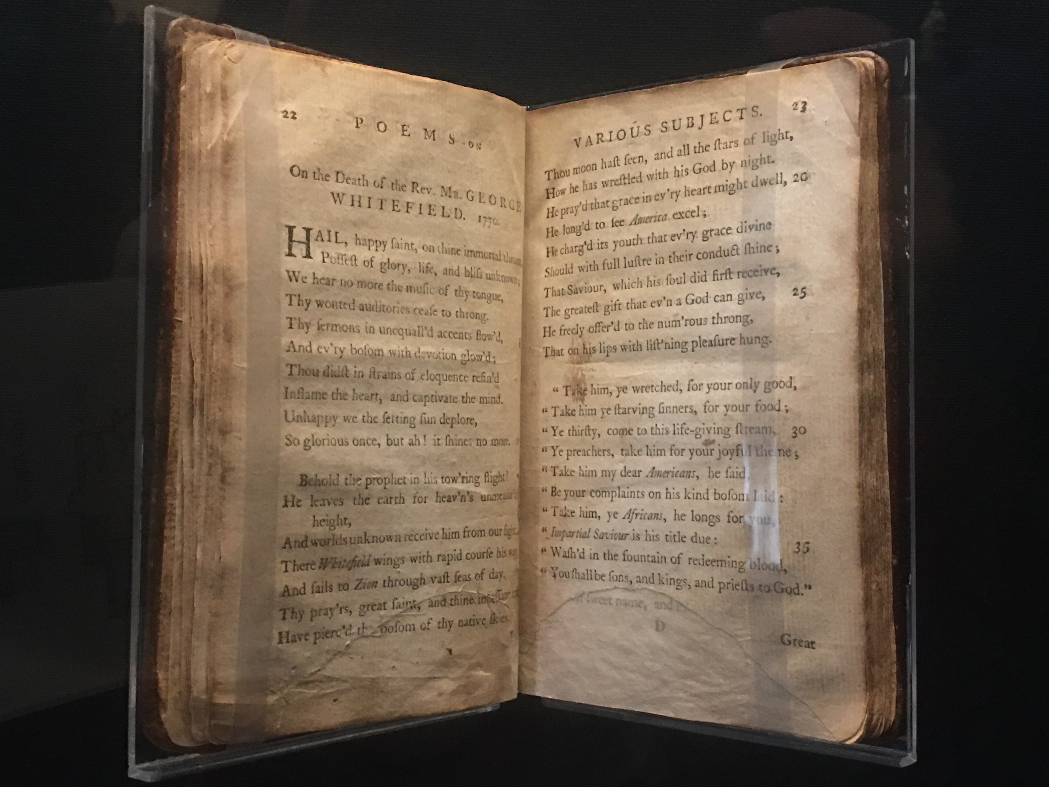 This is an original copy of one of Wheatley’s books, which I saw at The Museum of the American Revolution in Philadelphia, in October 2019.