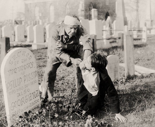 Pip meets Magwitch in the graveyard. A publicity still from a 1917 adaptation of the book from Paramount Pictures, accessed via Wikimedia Commons